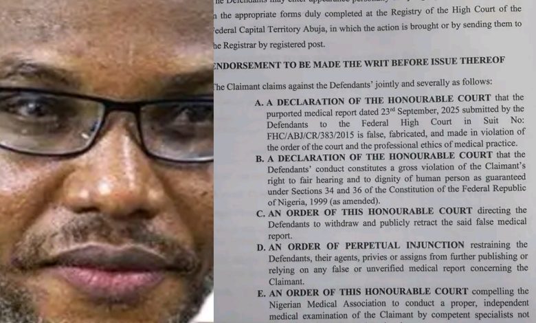 The leader of the Indigenous People of Biafra (IPOB), Mazi Nnamdi Kanu, has instituted a ₦550 million lawsuit against the Nigerian Medical Association (NMA), accusing the body of issuing a forged medical report about him.