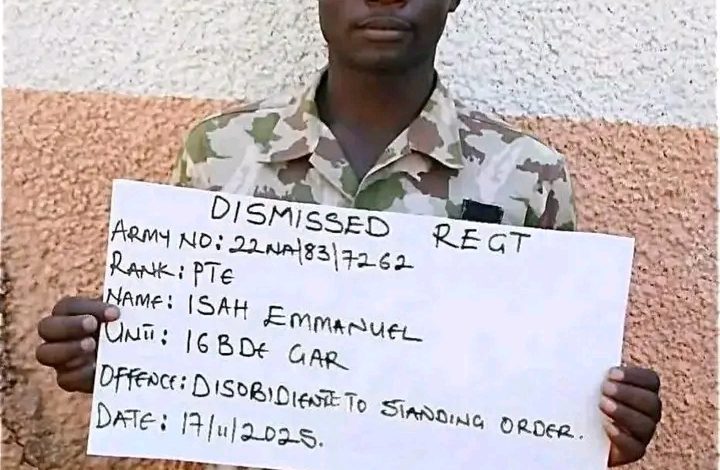 Dismissed Regiment: 16 Brigade GarrisonRank: PrivateName: Isah EmmanuelOffense: Disobedience to standing orderDate: 17/11/2025
