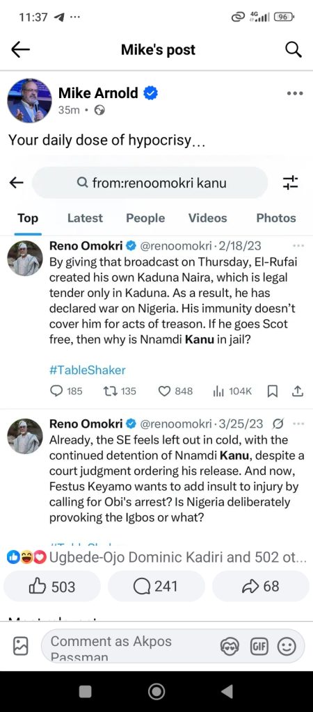 The clash began after Arnold posted a compilation of Omokri’s 2023 tweets on Nnamdi Kanu, El-Rufai, and national security—tweets many Nigerians say sharply contradict Omokri’s current positions. Arnold captioned the compilation: “Your daily dose of hypocrisy…” — a jab that immediately ignited heated debate across X (formerly Twitter).