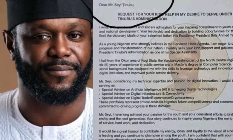 The letter, written by 33-year-old ICT specialist and governance professional Prince Godwin Oloruntoba, requested Seyi Tinubu’s support in securing a federal appointment as a Special Assistant under President Bola Ahmed Tinubu’s administration.