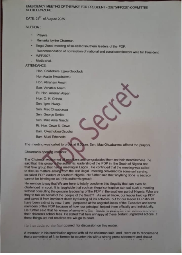 The minutes of the meeting described as ‘top secret’ and exclusively obtained by SaharaReporters quoted the chairman as saying, “It is laughable that such an illegal contraption can call such a meeting without consulting the genuine leadership of the PDP in the southern part of Nigeria. ‘Who are they to talk on behalf of the people of the South?’