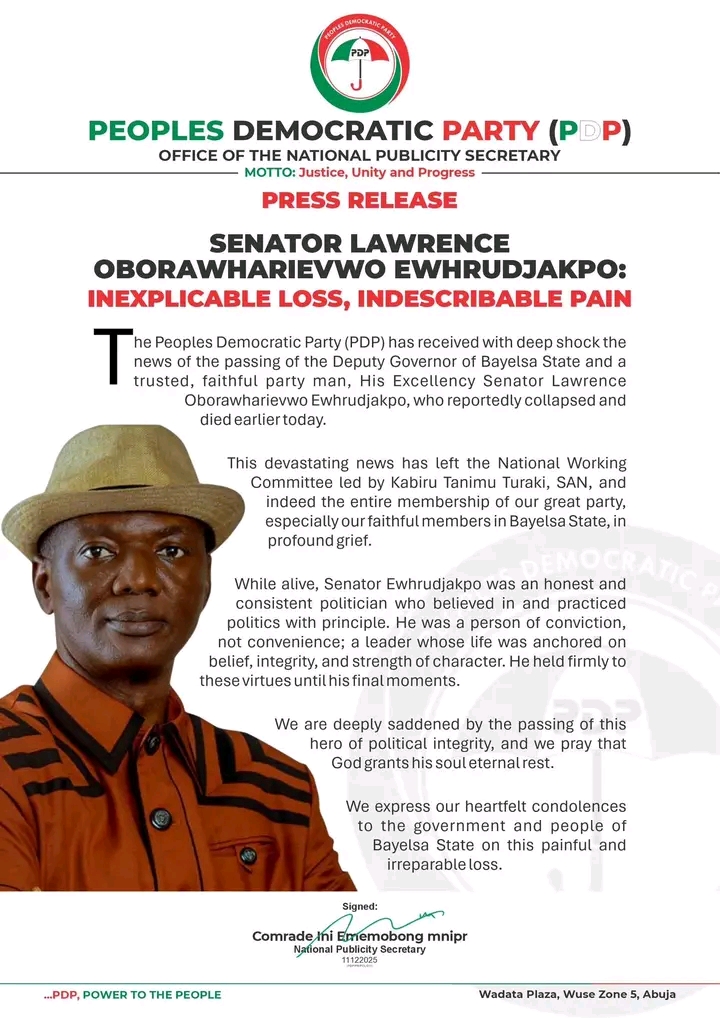 ABUJA — The Peoples Democratic Party (PDP) has expressed deep shock and sorrow over the sudden death of the Deputy Governor of Bayelsa State, Senator Lawrence Oborawharievwo Ewhrudjakpo, who reportedly collapsed and died earlier today.