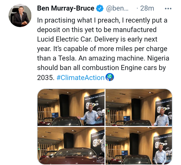 Ban all combustion Engine cars by 2035, as I expect my Lucid Electric car early next year– Ben Murray Bruce